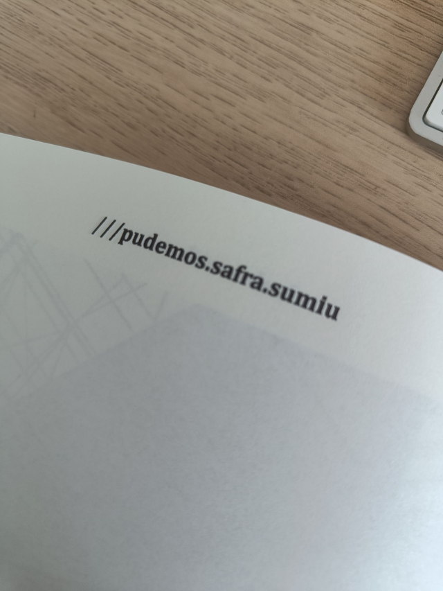 Publicação de Rui Luís onde o caminhar enquanto forma estética, enquanto forma de pensamento, resulta numa publicação sobre uma única caminhada onde são captadas várias fotografias, tomadas notas, e alguns dados. Cada fotografia, cada texto, cada palavra são relacionados com um elemento agregador que é a coordenada da sua localização, que aqui em vez de serem utilizados os dados de localização/coordenadas comuns são usados os dados de uma aplicação (what3words) que dividiu o mundo em quadrados de 3 metros e deu a cada quadrado uma combinação única de três palavras. Cada volume tem a edição de 24 exemplares numerados e assinados.